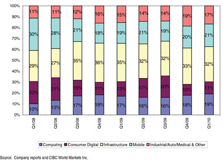 This segment represented 32% of sales (versus 33% in Q4/F09) and was flat quarter-on-quarter to $1.86 billion in revenue. This quarter Flextronics saw some strength in networking and optical, which helped to offset the weakness at Nortel. Flextronics believes that after the sale of these Nortel assets, it will be able to maintain this business. Nortel was not broken out this quarter by Company management but represented $244 million in Q4.