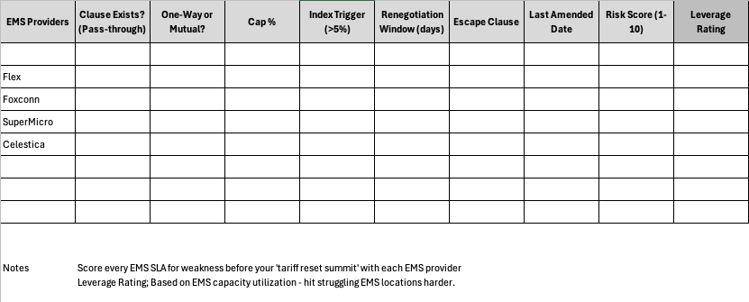 In a volatile supply chain with dynamic tariffs and uncertainty, one overlooked contract clause can cost OEMs millions in penalties, disputes, or delays. This ready-to-use Excel template helps you audit your EMS manufacturing contracts in minutes: Track risks, identify automated alert opportunities, and ensure compliance.